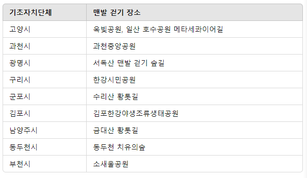 경기도의 아름다운 산책로가 많습니다. 더 많은 산책로를 확인하시려면 아래 버튼을 이용하여 추천 맨발 걷기 장소를 확인해 보세요.
